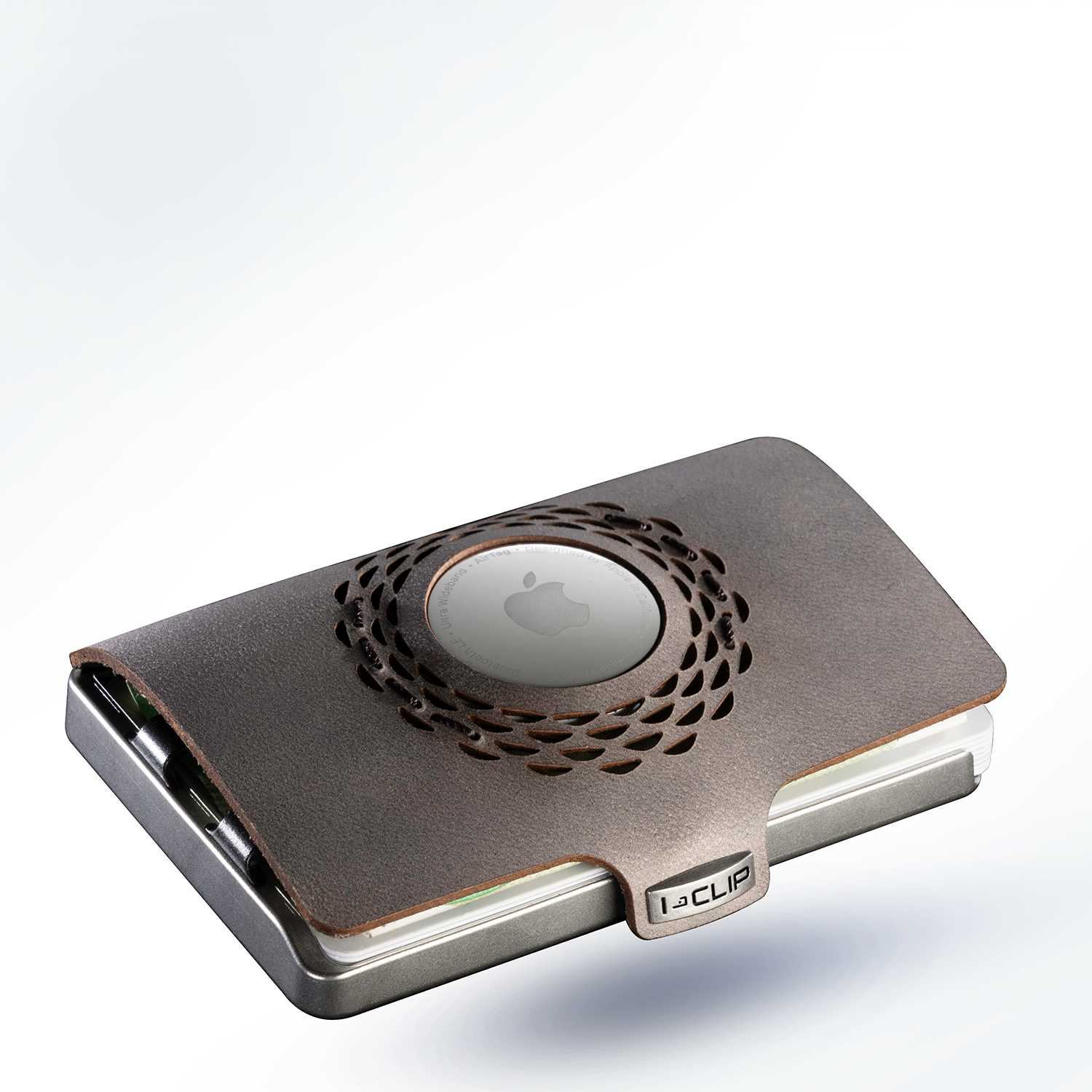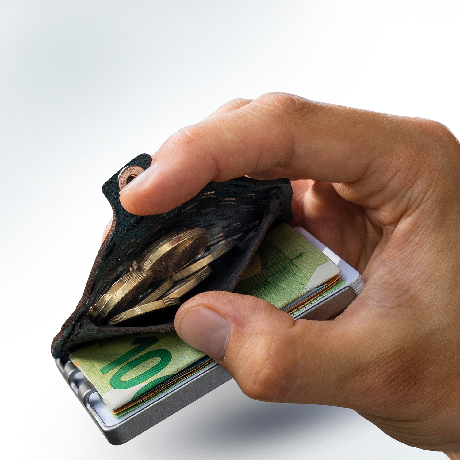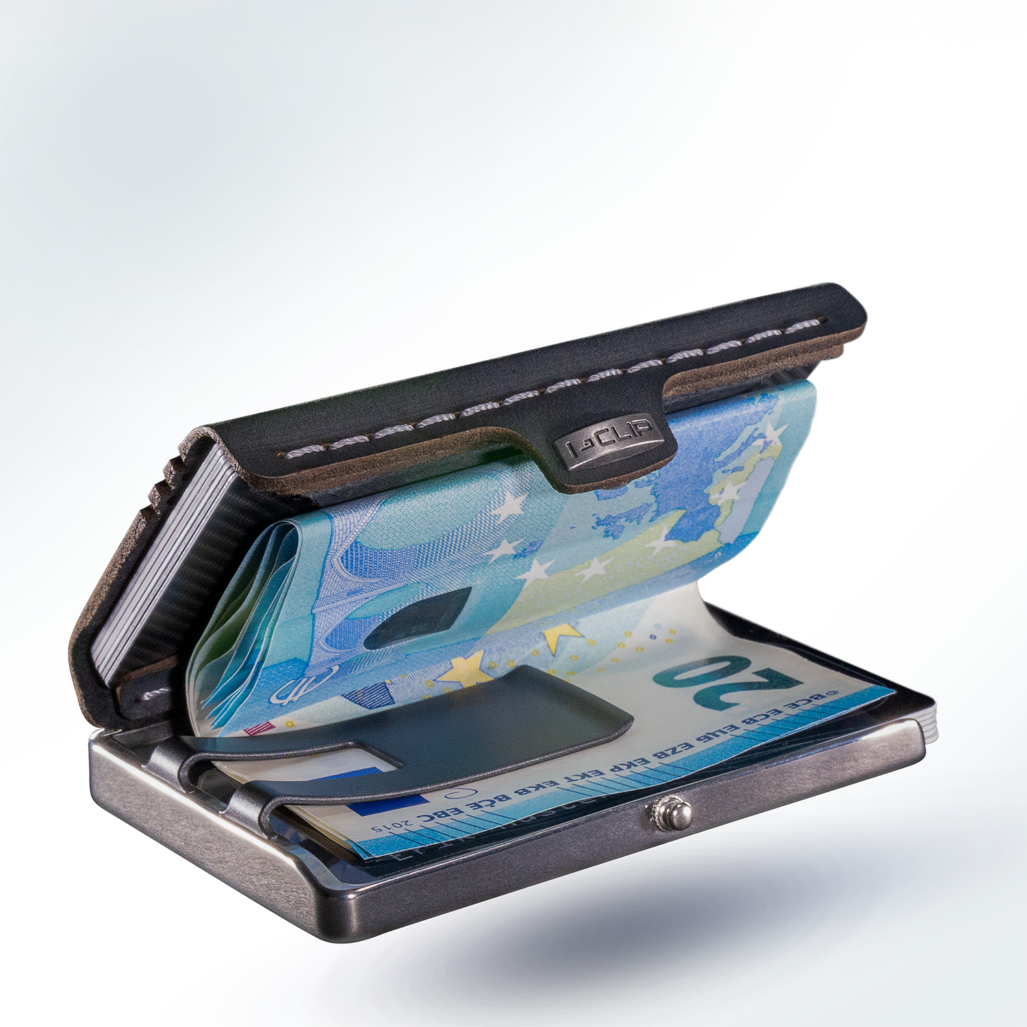 Das elegante Ledercover legt sich über den Inhalt und wird durch einen Druckknopf mit dem Rahmen vereint, sodass Karten sowie Geldscheine vor Beschädigung und Verlust geschützt sind.