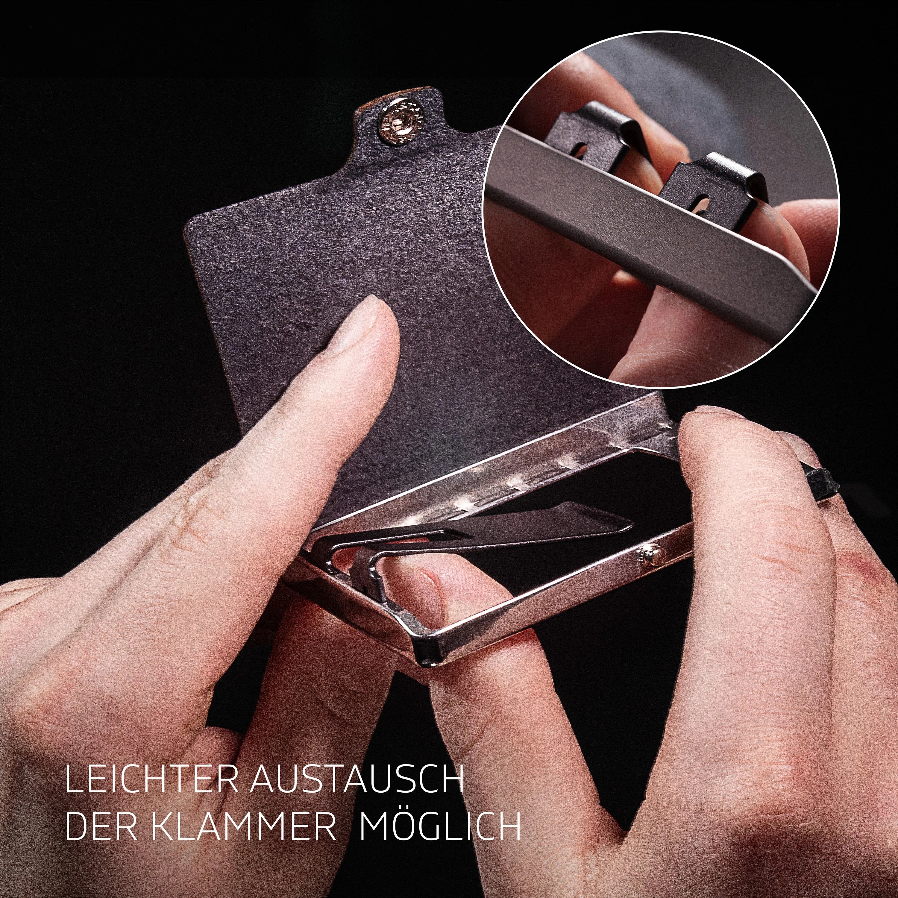 To remove the clip from the I-CLIP, please follow these simple steps. First, hold the I-CLIP with the opening facing upwards to make the clip clearly visible. Then gently press the bottom part of the clip to move it slightly upwards. At the same time, move the top part of the clip slightly downwards. This action will release the clip from the I-CLIP. To close the clip, simply press the two sides together until they click into place. With this straightforward guide, the I-CLIP clip can be easily removed and reattached to keep your valuables safe and organized.