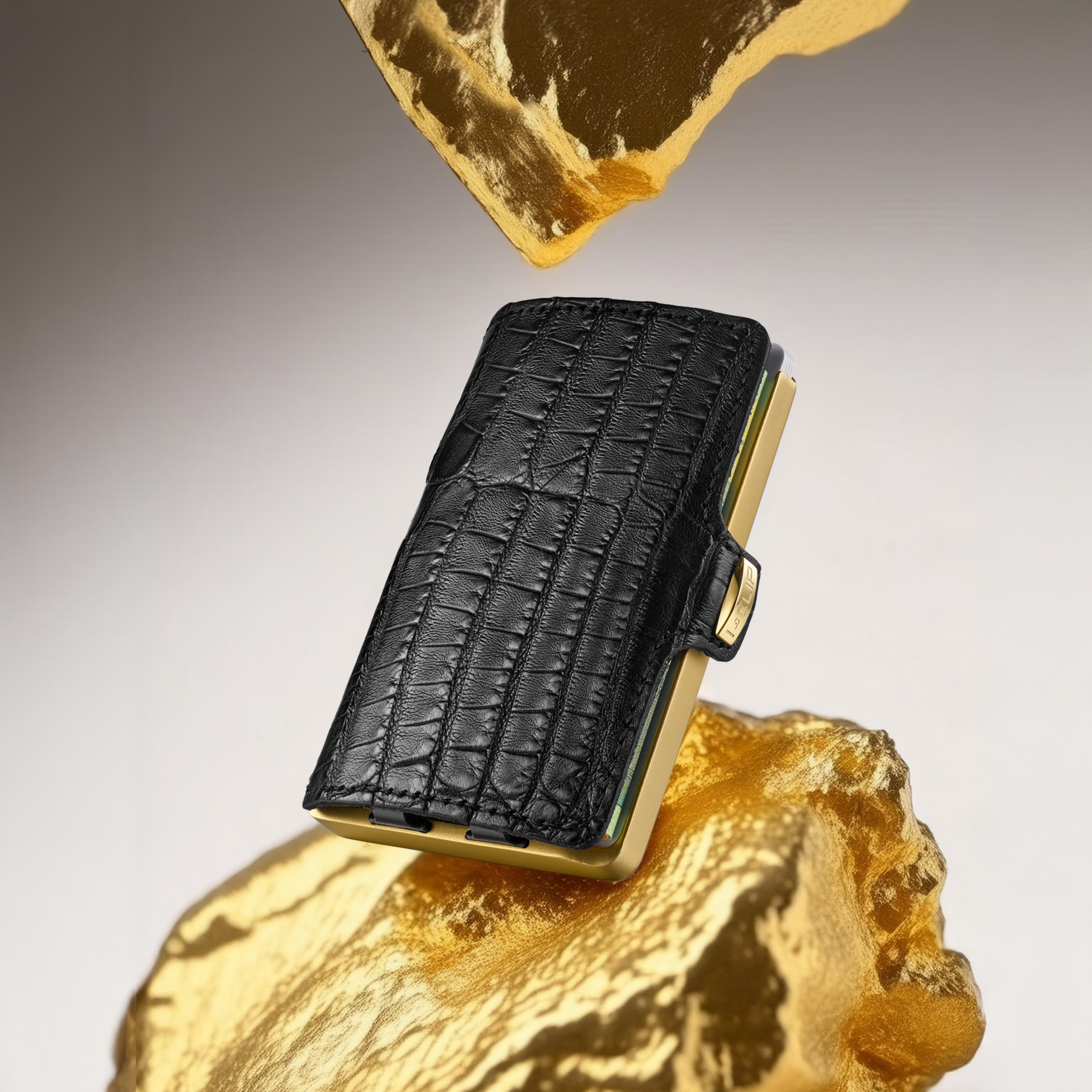 Der I-CLIP Gold besticht durch sein edles Erscheinungsbild und die Verwendung feinster Materialien. Das Gehäuse ist aus 80 Gramm 750er Gold, welches nicht nur beeindruckend aussieht, sondern auch für besondere Langlebigkeit sorgt. Die Kombination aus luxuriösem Gold und erstklassigem Leder macht diesen I-CLIP zu einem unverzichtbaren Begleiter für jeden, der Wert auf Stil und Qualität legt.
